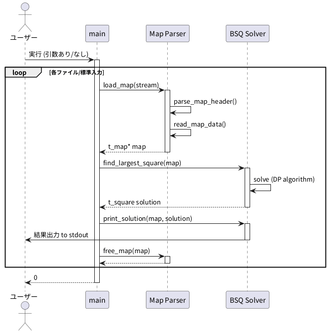 load_map(): ストリームからマップ構造体を生成。ft_error()。find_largest_square(): 最大正方形を探索。print_solution(): 結果を出力。free_map(): メモリ解放。load_map() を呼び出し、戻り値の t_map* を受け取る。NULL の場合、マップエラー ("map error") を出力して関数を終了する (return)。find_largest_square() を呼び出し、解 (t_square) を取得する。print_solution() を呼び出し、解を反映したマップを出力する。free_map() を呼び出し、使用したメモリをクリーンアップする。| [in] | stream | 読み込み元のファイルストリーム (stdin または ファイル) |