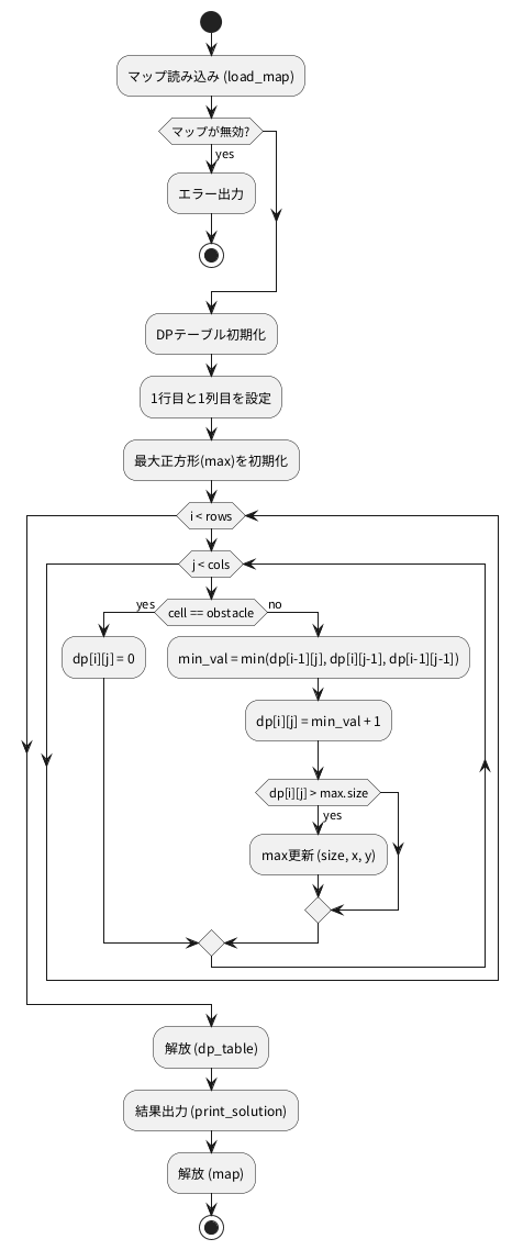 dp[i][j] は、(i, j) を右下角とする正方形の最大サイズを表す。dp[i][j] = 0dp[i][j] = ft_min(dp[i-1][j], dp[i][j-1], dp[i-1][j-1]) + 1dp テーブル(int**)を行数分確保し、各行を列数分確保する。i=0) と 1列目 (j=0) をスキャン。1、障害物なら 0 を設定。largest_square) を更新する可能性があるためチェックを入れる。i=1, j=1 から開始する二重ループ。0。dp[i][j] が largest_square.size より大きい場合、更新する。size が同じ場合、**「より上、そしてより左」** のものを優先するロジックを実装する。free(): 計算が終わったら dp テーブルを解放する。