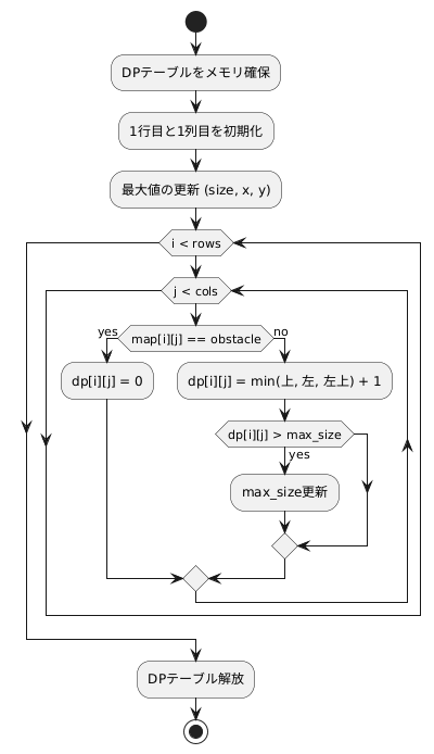 マップを走査し、各地点を右下とする最大正方形のサイズを計算する。